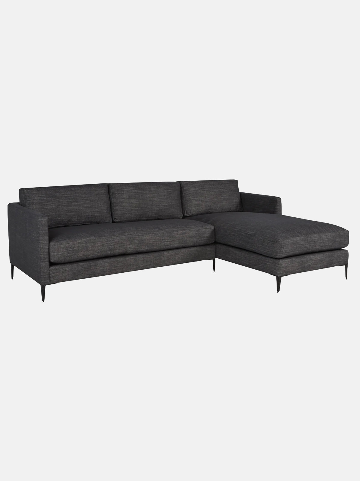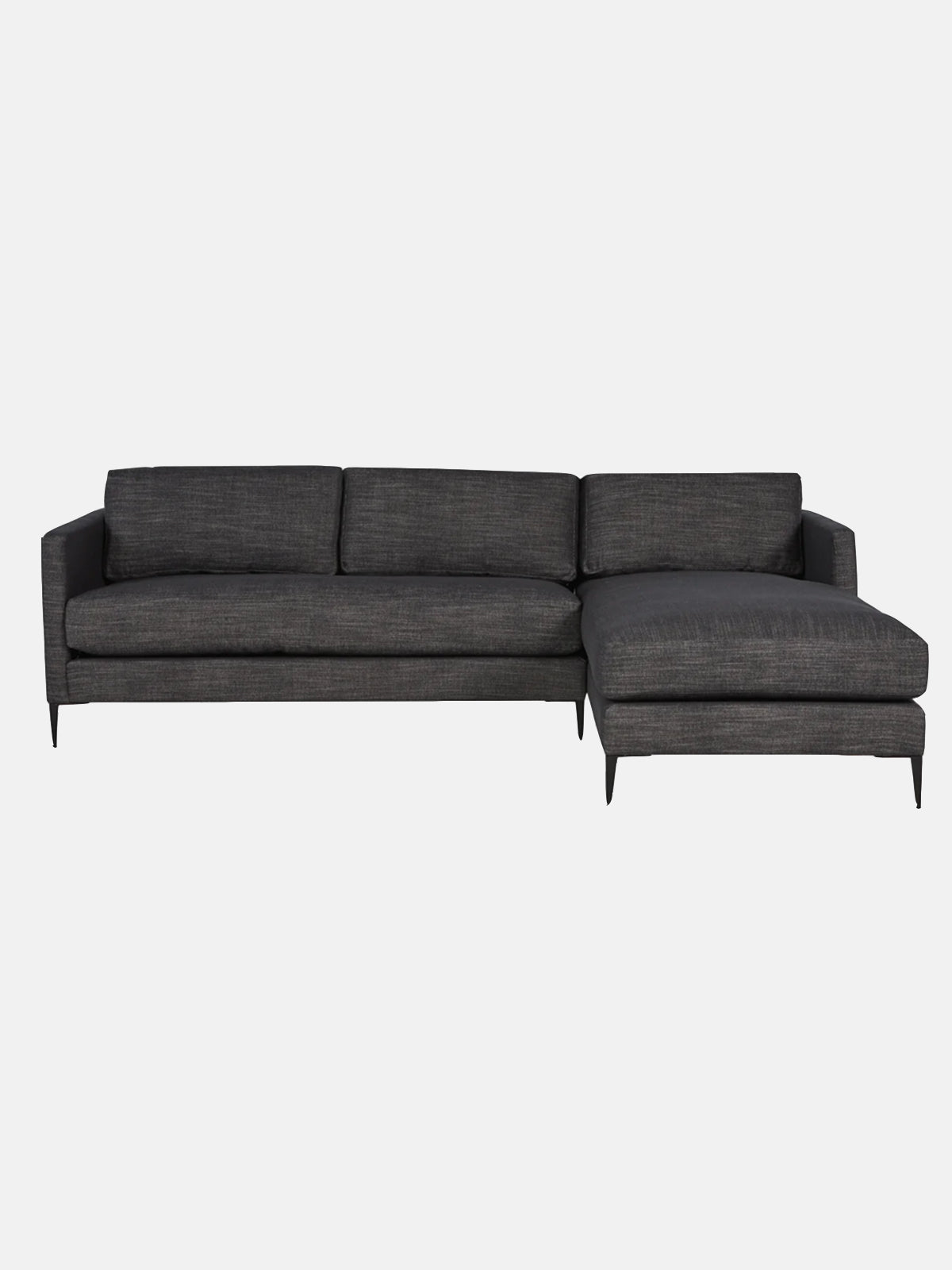 The Benedict Sectional is a modern design with clean lines and sleek metal legs in black rust. It has a fresh and functional aesthetic with no-sag support. It has a smaller scale footprint, making it ideal for apartment living and suitable for any occasion.
