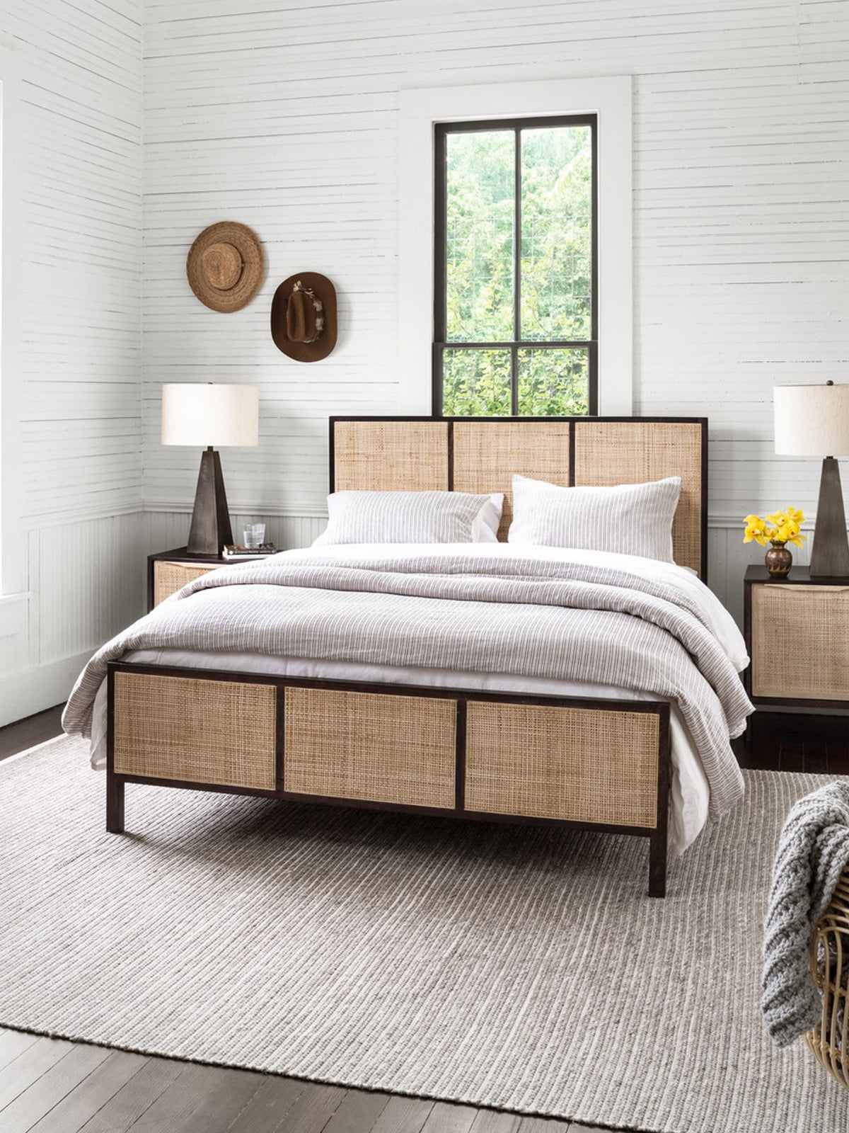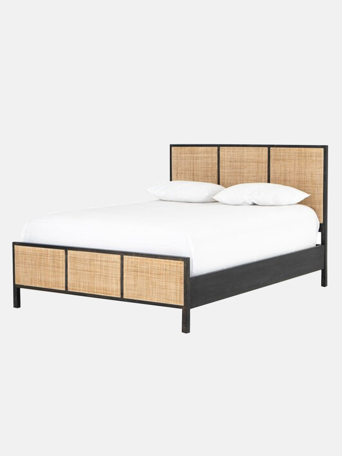 Black-washed mango frames inset woven cane, for a textural look with eye-catching contrast. Three-panel head and foot boards add a detail-rich touch.
