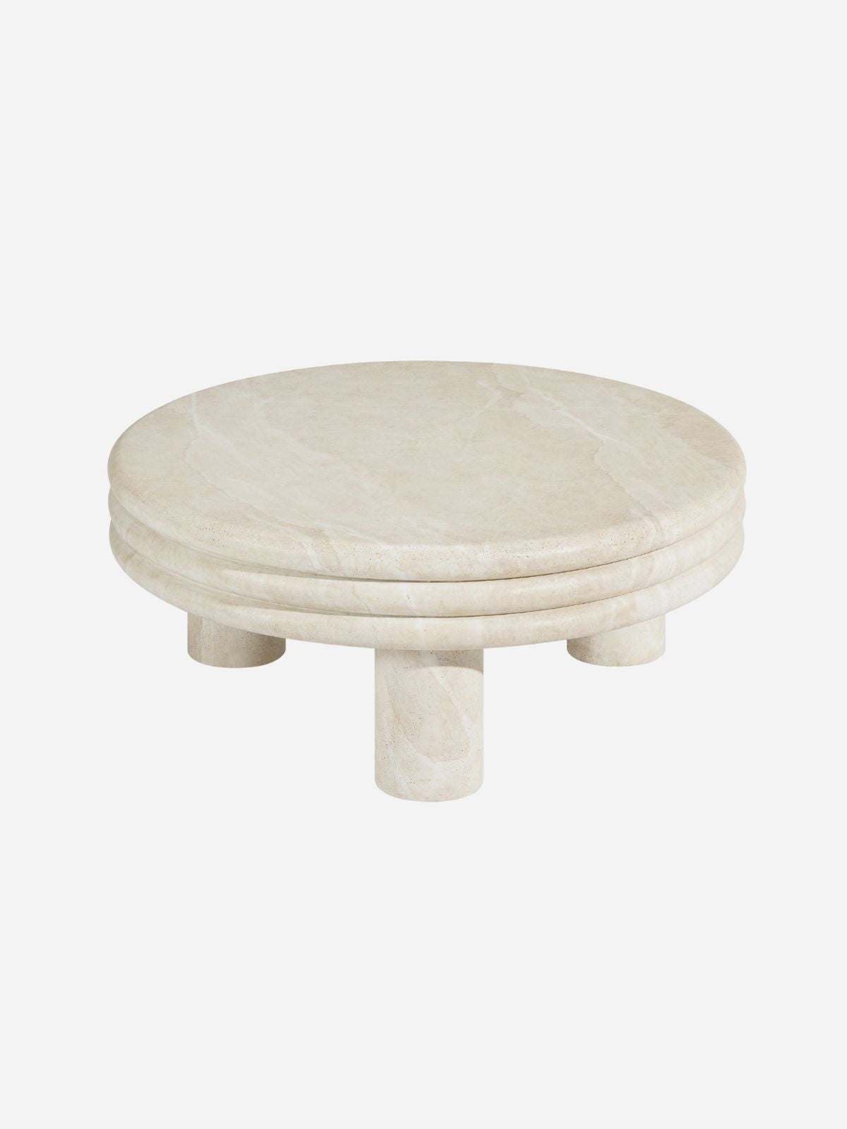 Bring style to your space with our Brittny coffee table. Crafted in faux-travertine, the table exhibits a three-layer circular top with three column-style legs. The low profile is perfect for living or family rooms. The faux-travertine finish is outdoor safe, so can be used on a patio or terrace.