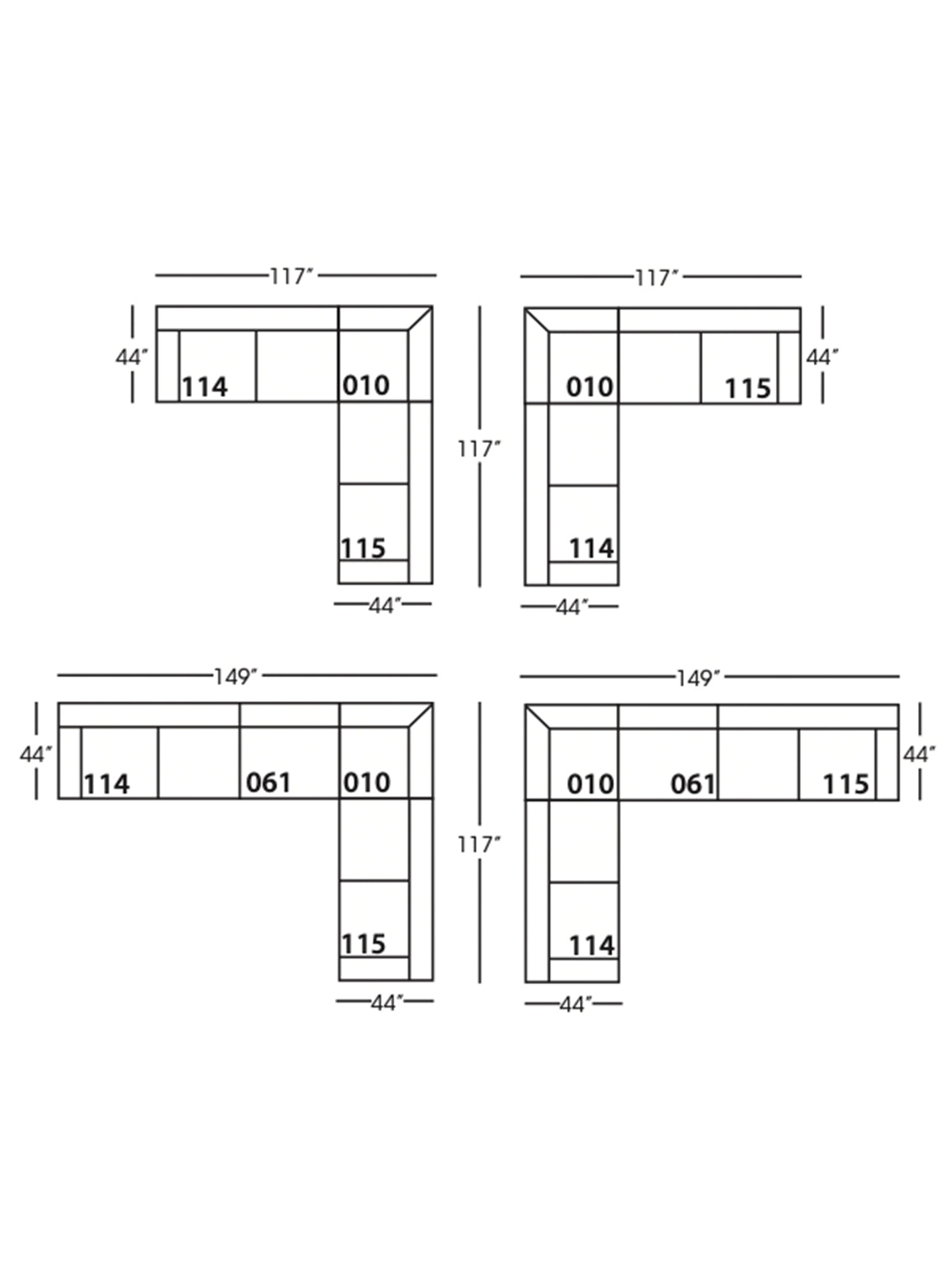 - Corner: 44"L x 44"D x 36"H