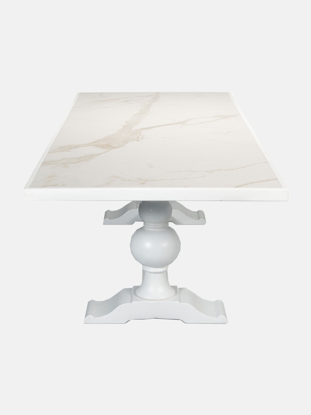 The Cortina Marble Dining Table has a beautiful trestle base in cortina white finish which supports an unexpected porcelain top fashioned to resemble marble.