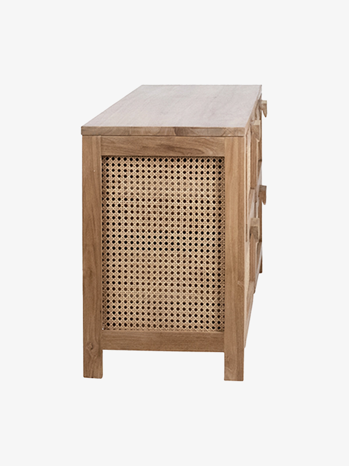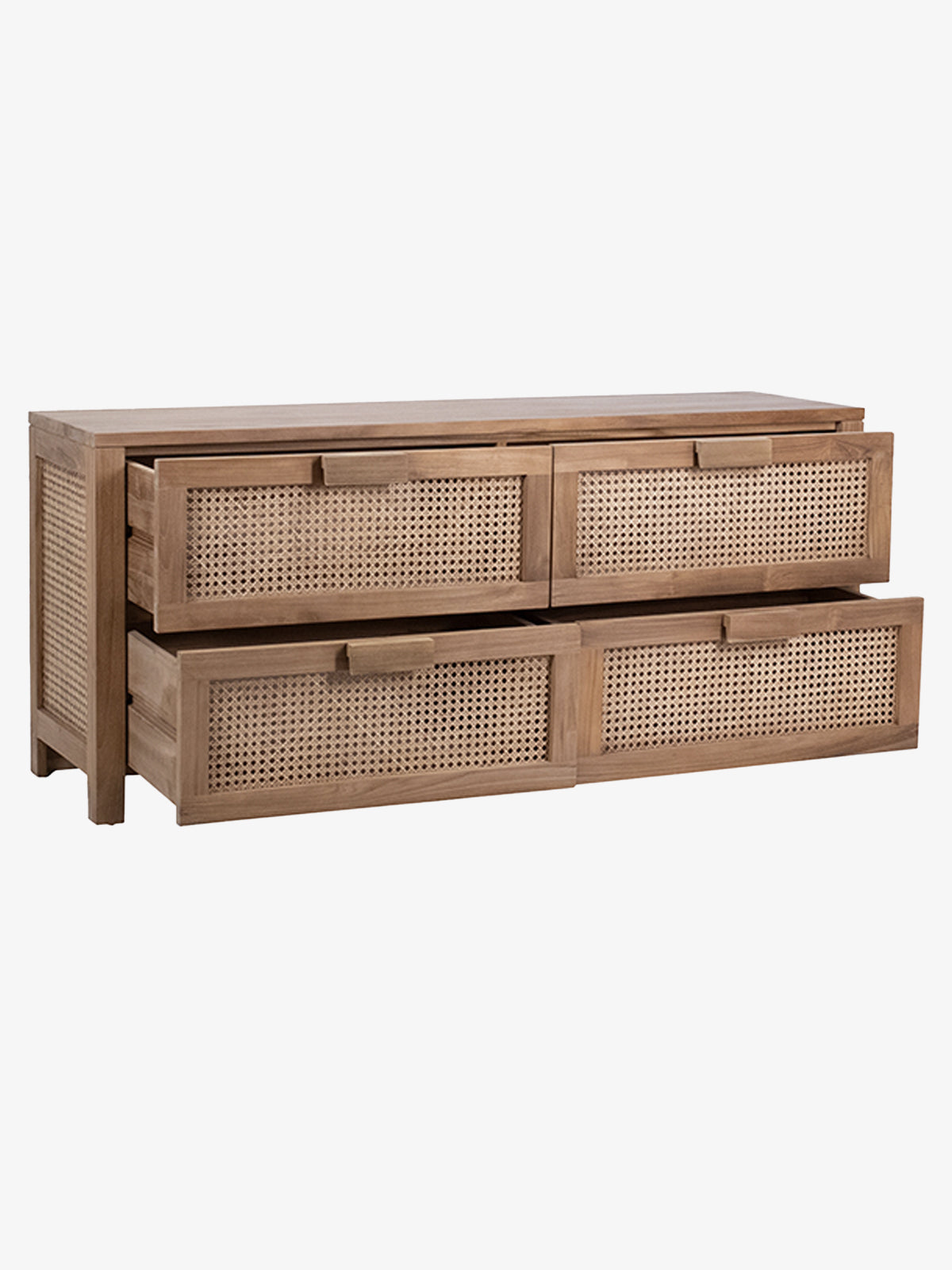 This beautifully designed 63” teakwood sideboard will be the perfect companion to both modern and traditional aesthetics. Featuring rattan details that add texture and an artisan touch to the four drawers and side panels. The ample interior offers plenty of storage for dining room or bedroom essentials.