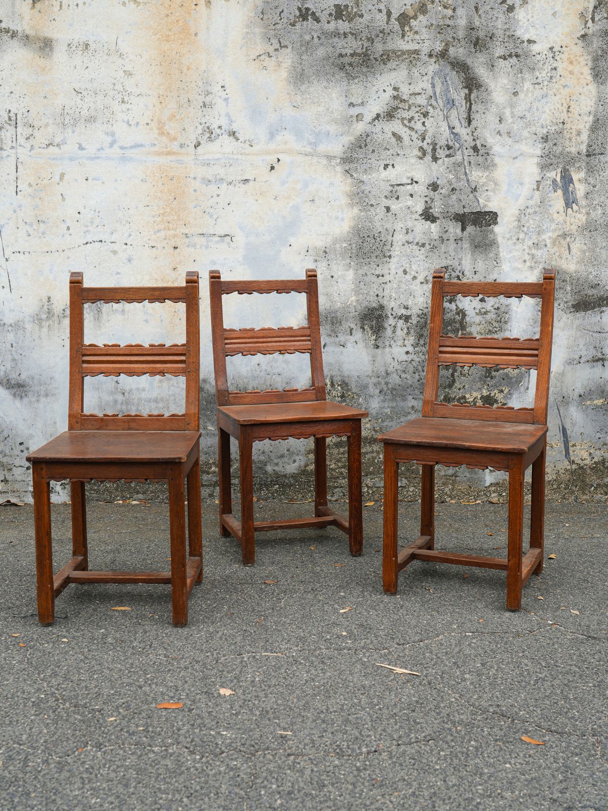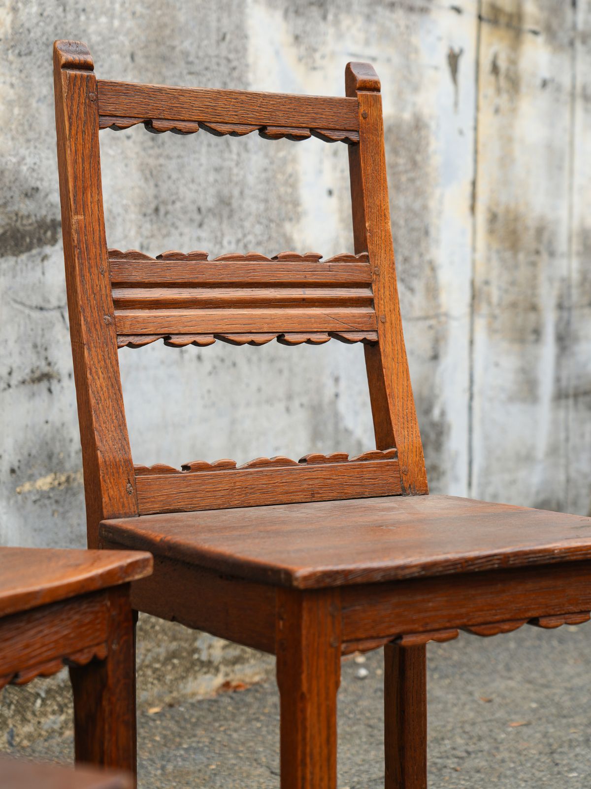Solid oak dining chair with a warm, textured finish and subtle carved detailing. A simple, well-made piece with natural character.