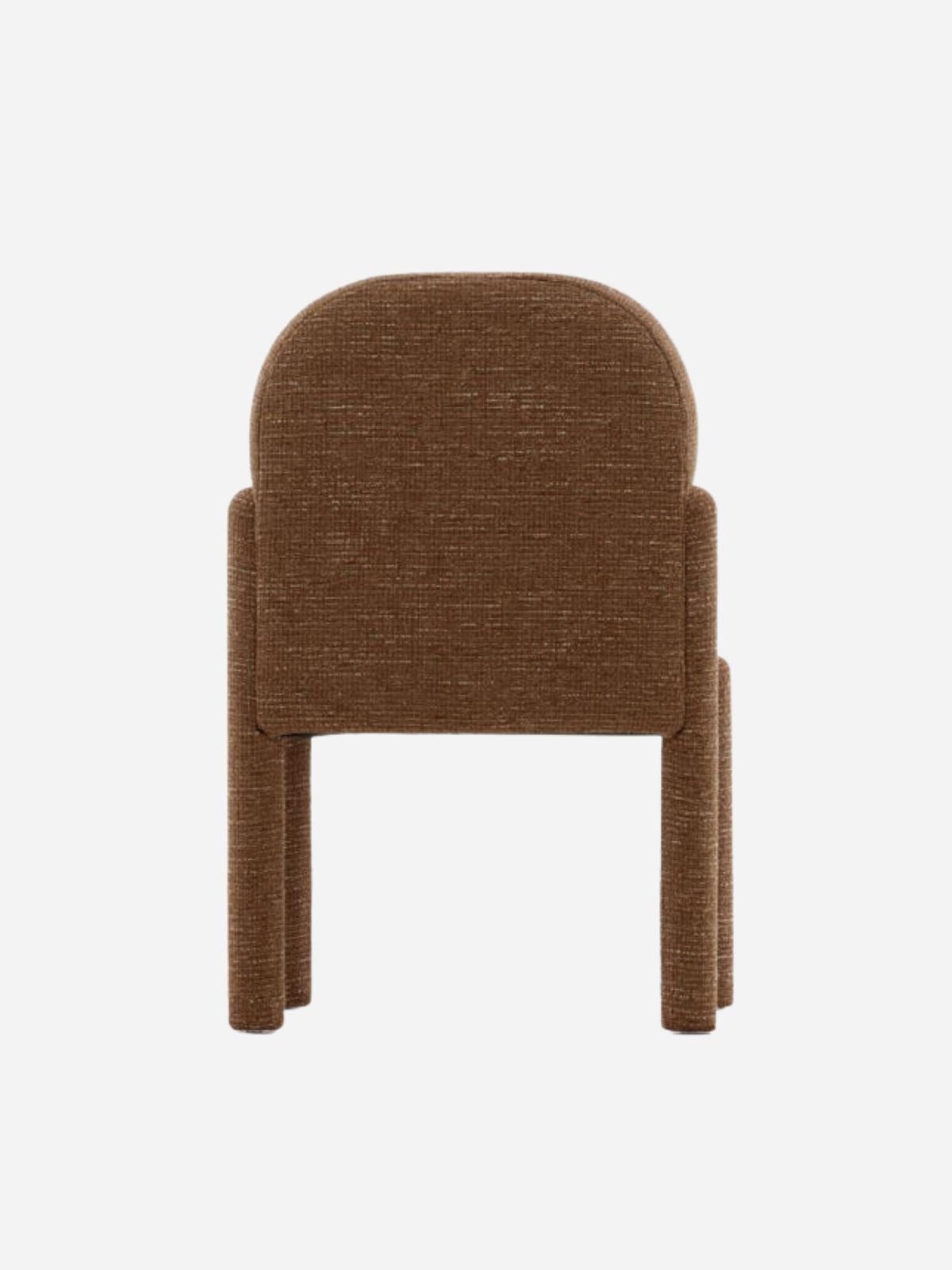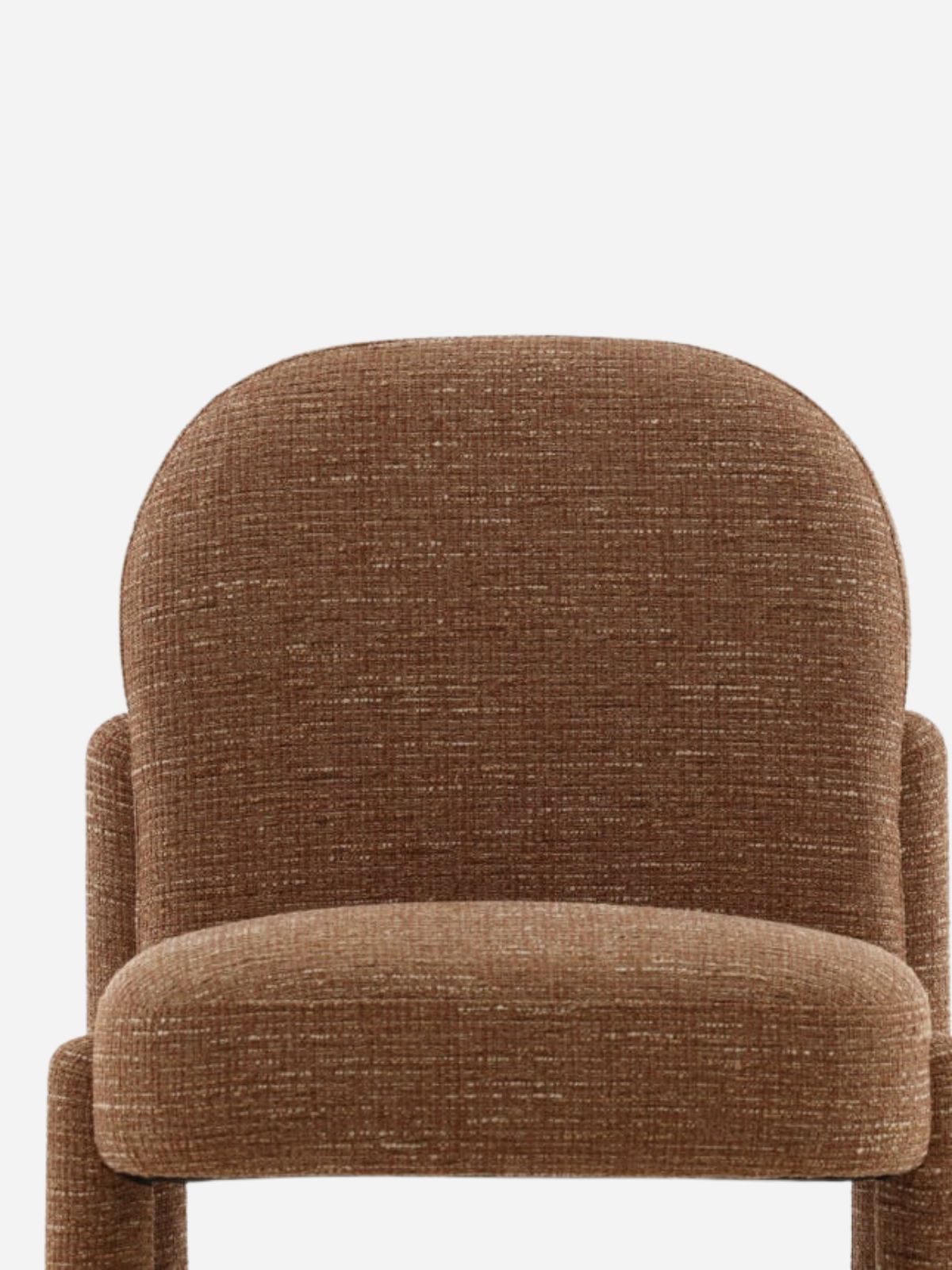 The Sans Dining Chair features a fully upholstered silhouette in a warm clay tweed fabric. Comfortable, modern, and refined, this chair brings subtle texture and softness to any dining setting.