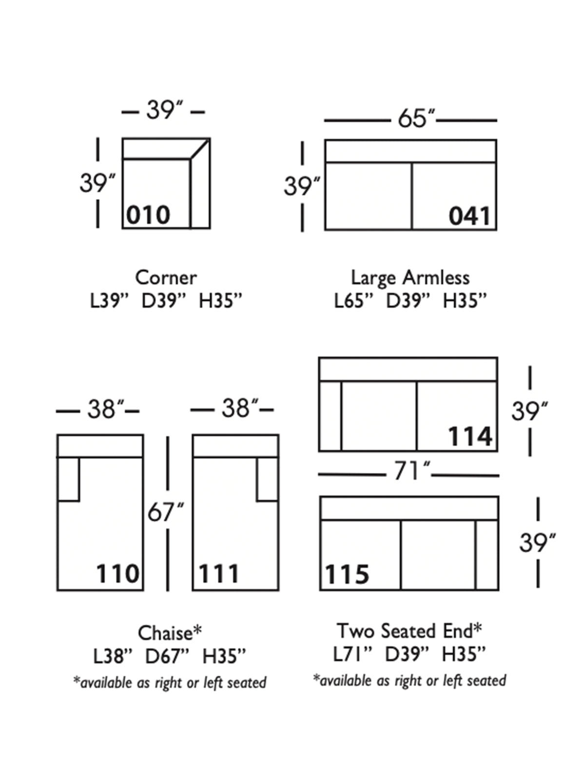 - Right/Left Seated Chaise: 38"L x 67"D x 35"H