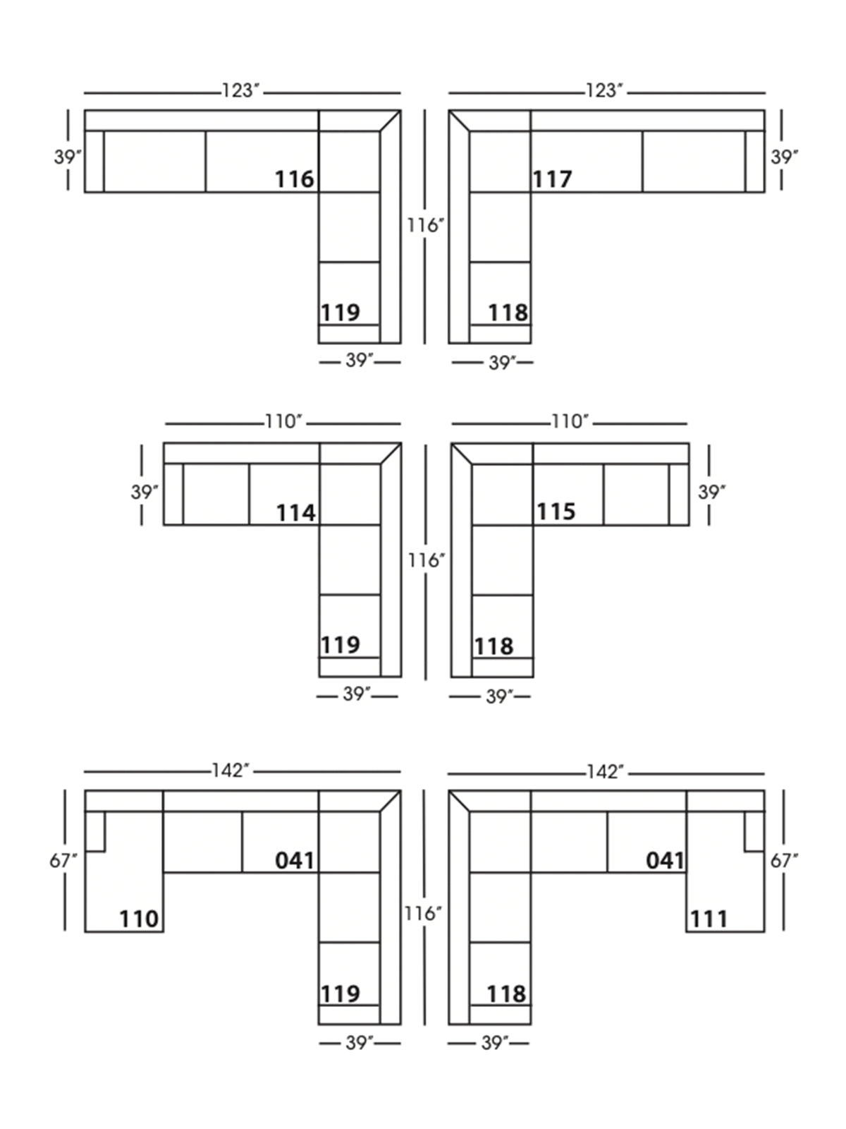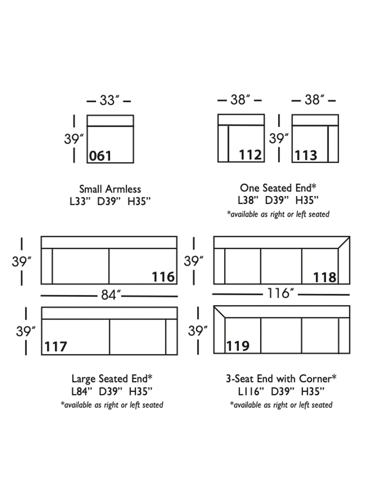 - Right/Left Three Seat End with Corner: 116"L x 39"D x 35"H