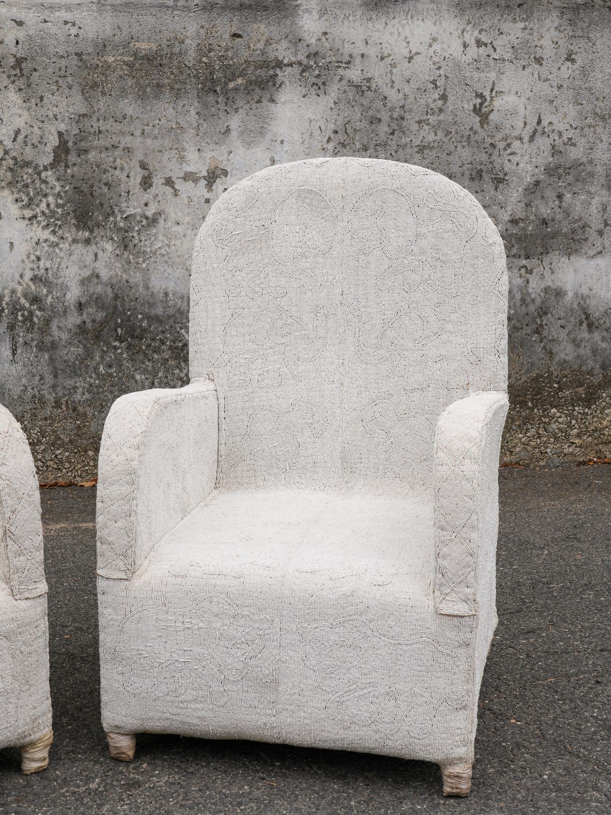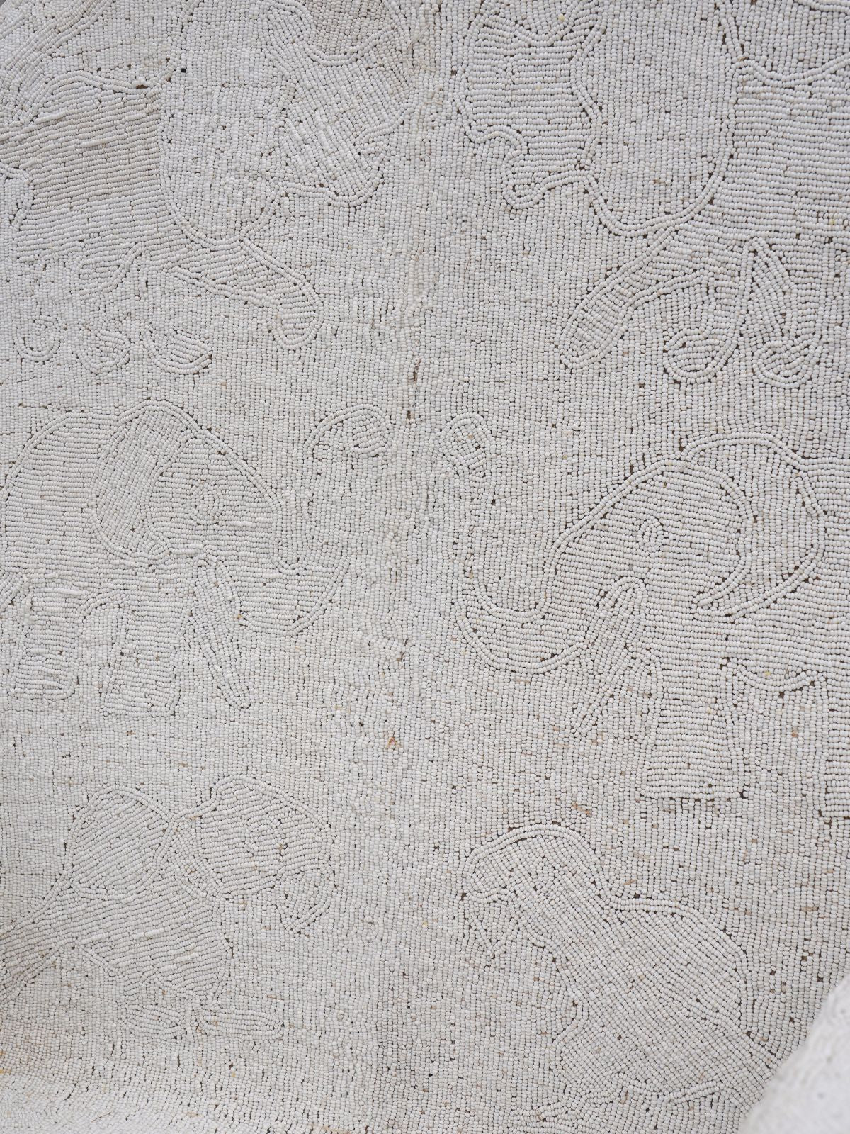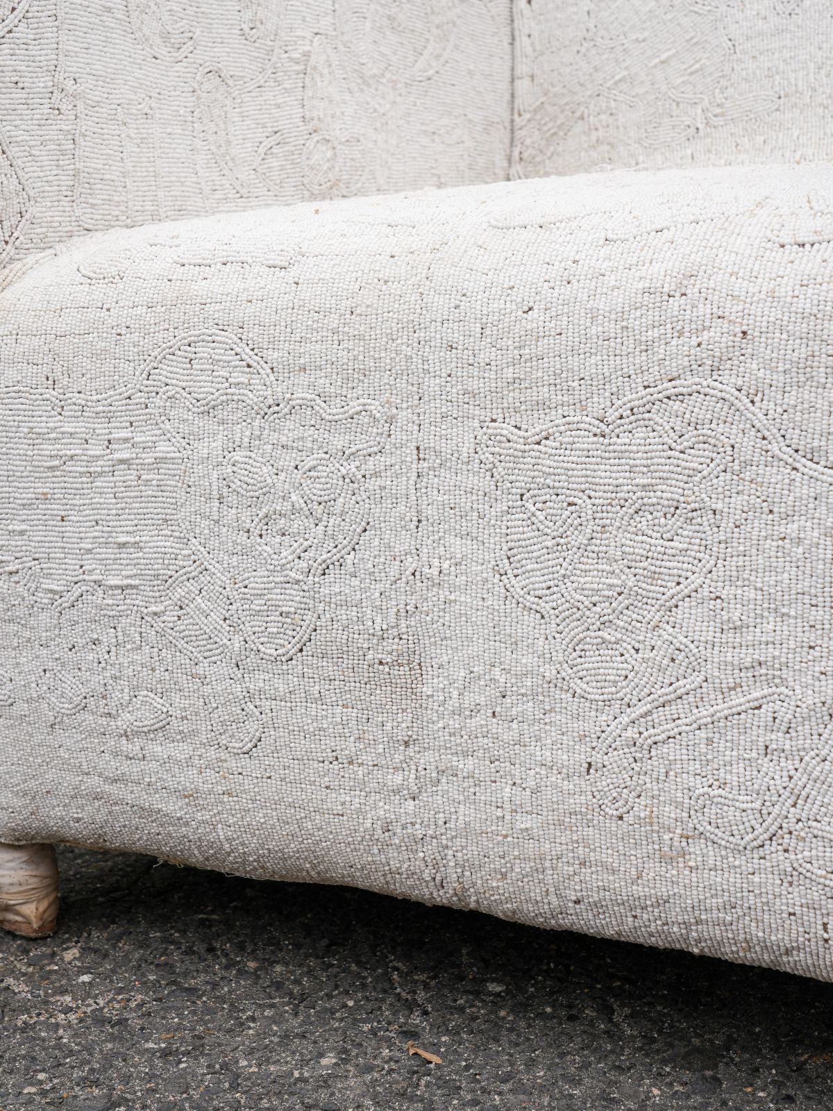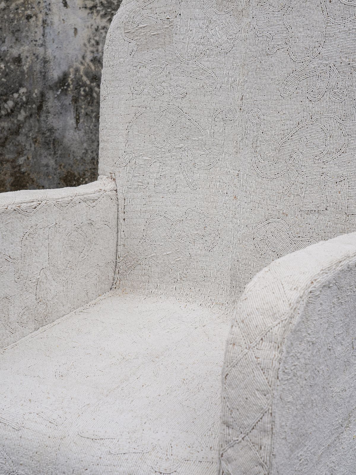 Each chair is built on a carved wooden frame and covered in intricate beadwork, with thousands of glass beads carefully applied to fabric and stitched into place by hand. The process is detailed and time-intensive, resulting in a richly layered, dimensional finish.