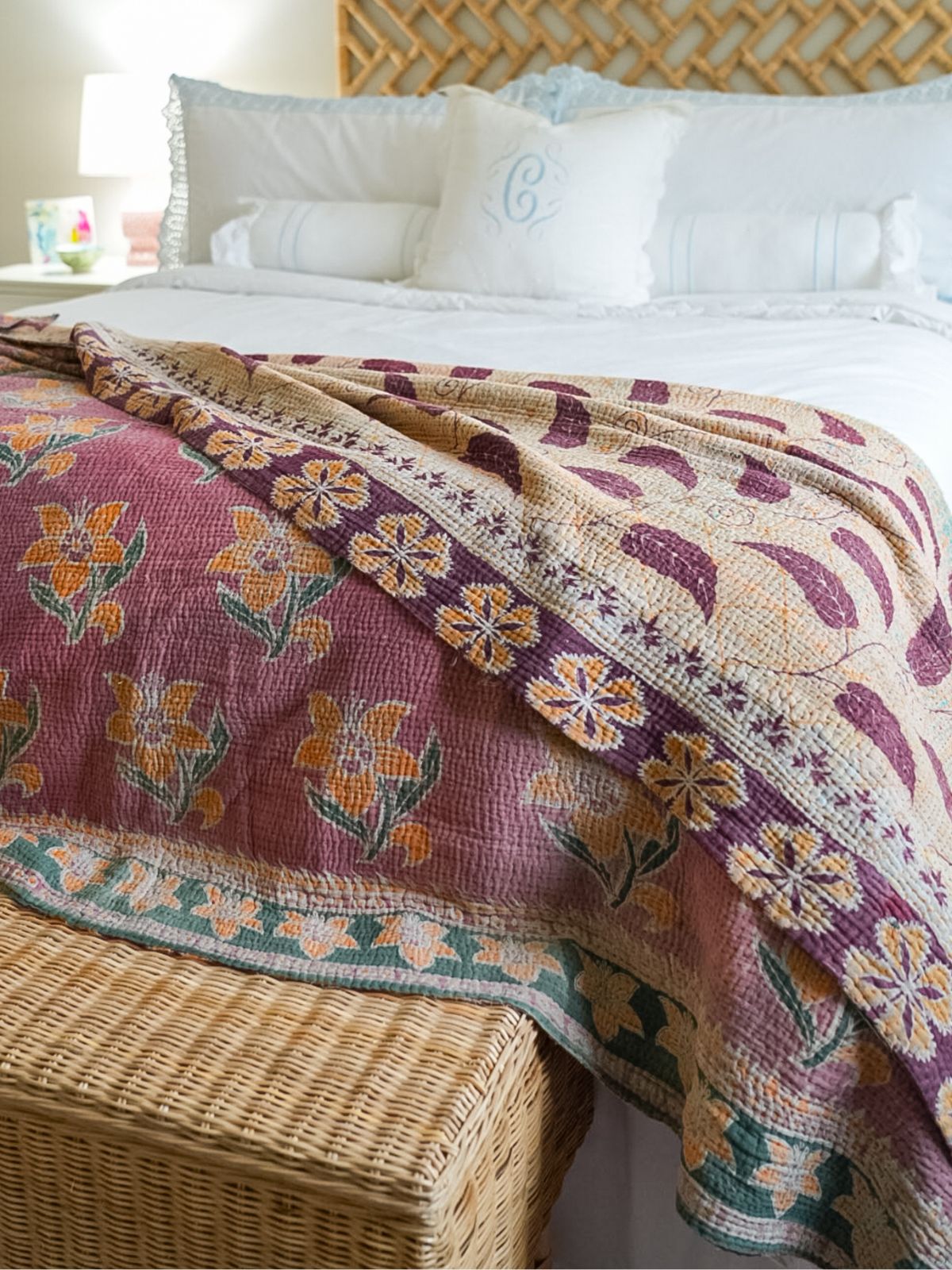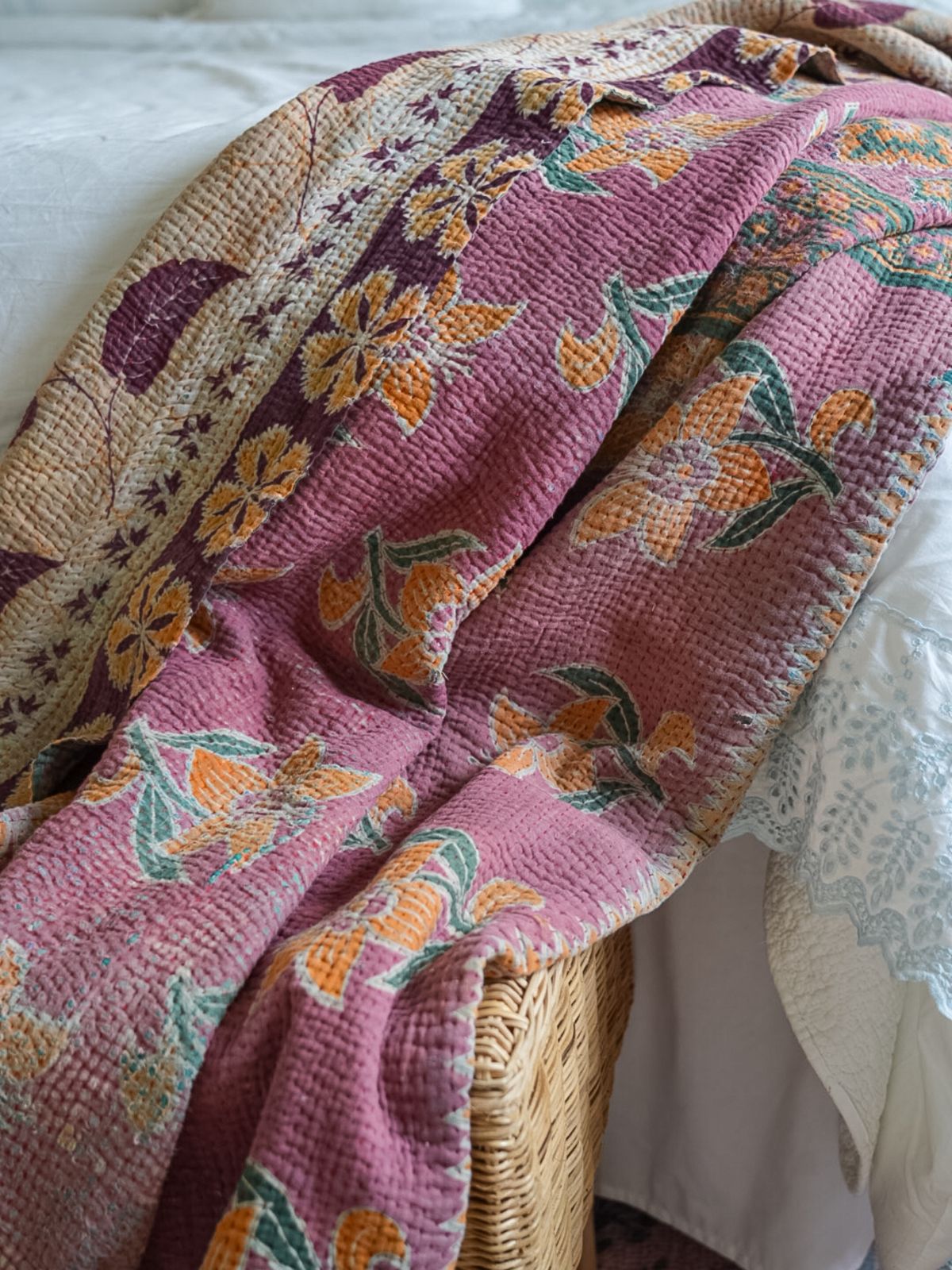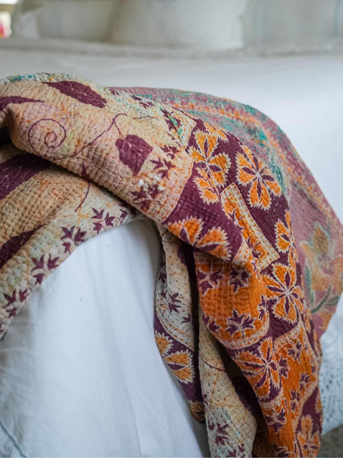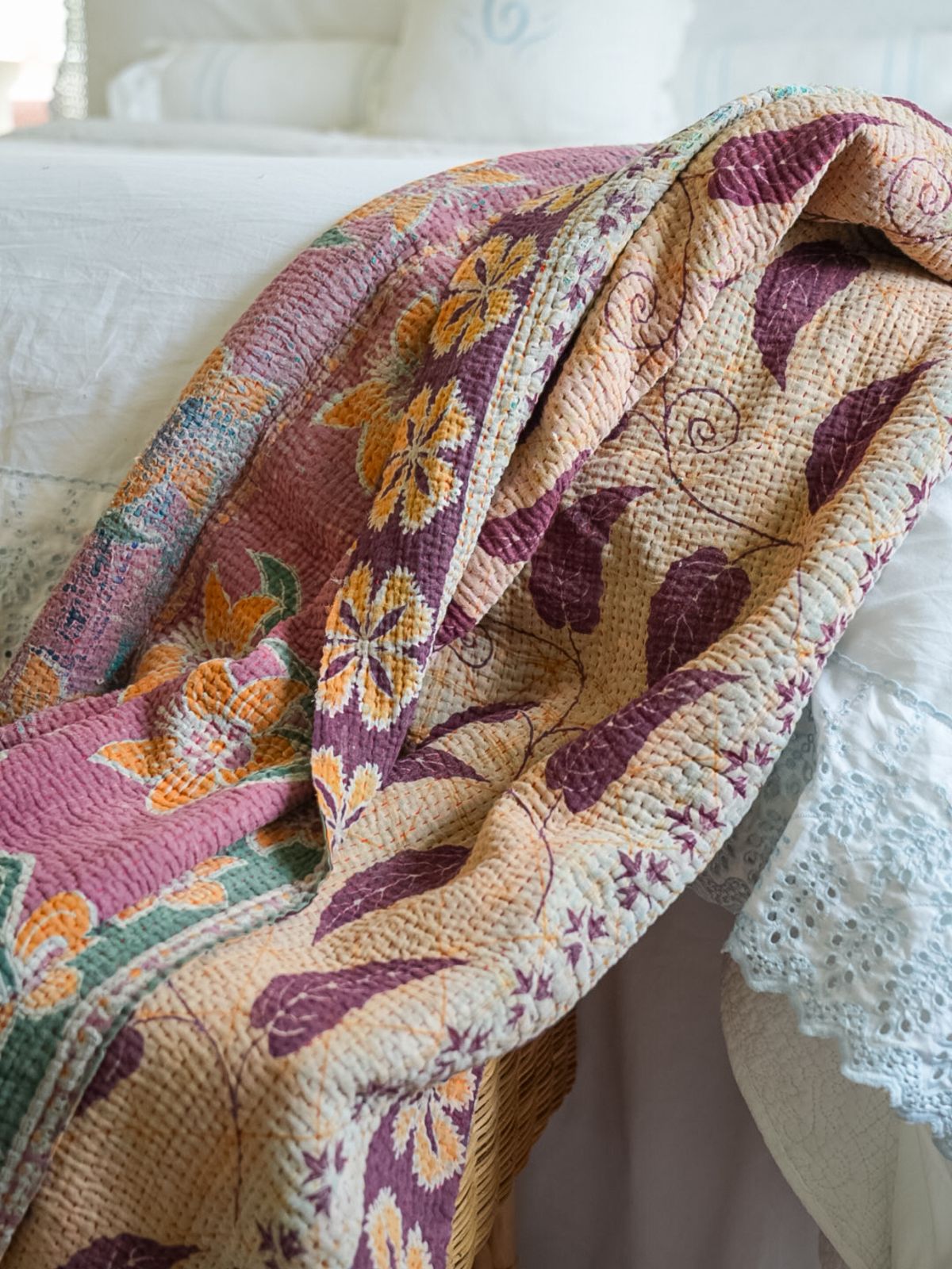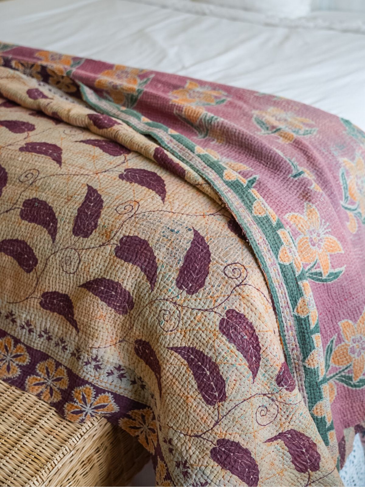 These Kantha Quilts are beautifully hand-stitched using layers of vintage cotton textiles, creating a richly textured, patchwork-style throw that is truly one of a kind. Colorful running stitches add depth and character, and each piece is reversible for effortless styling versatility. No two are exactly alike, making each quilt a small work of art.