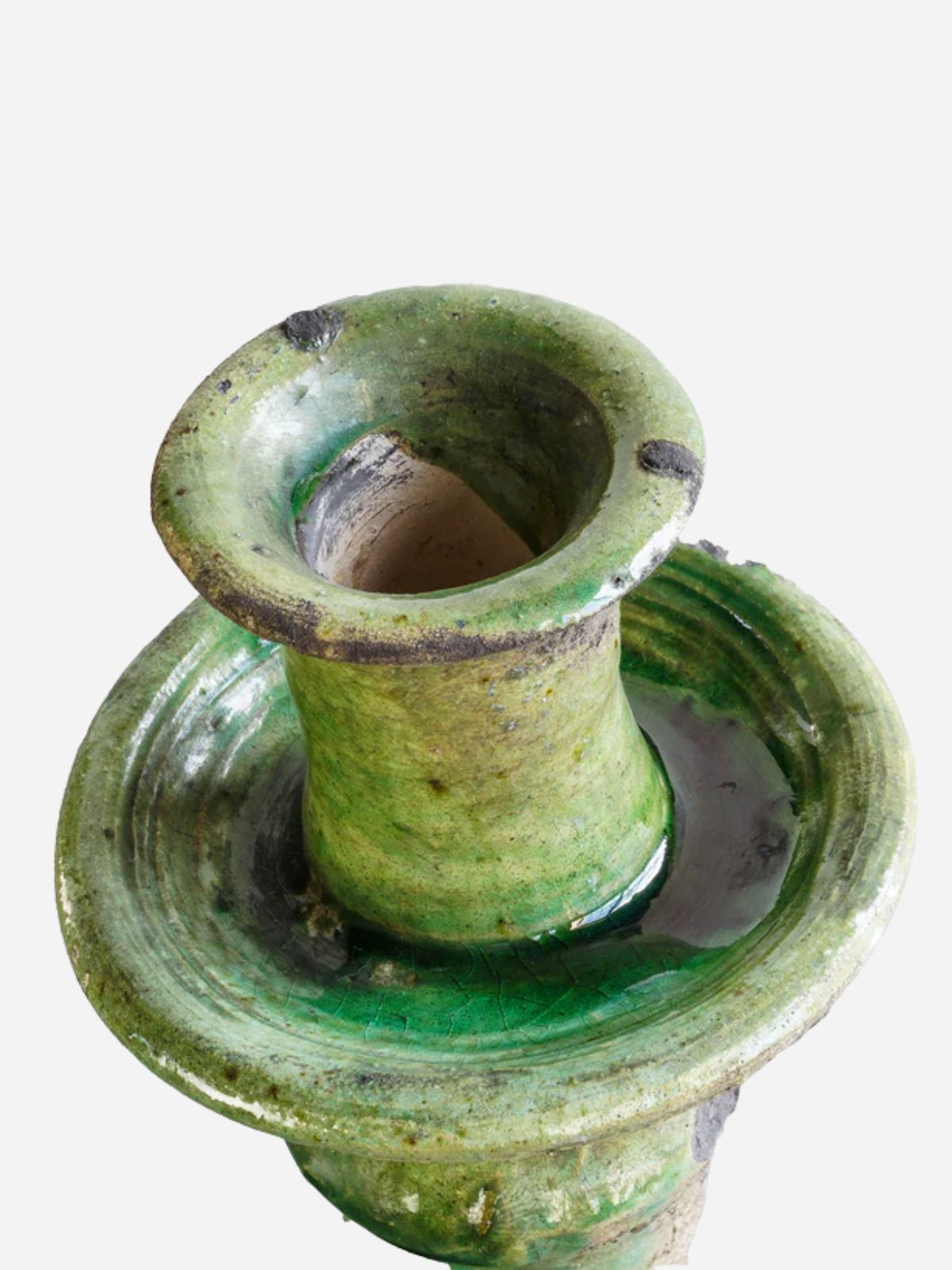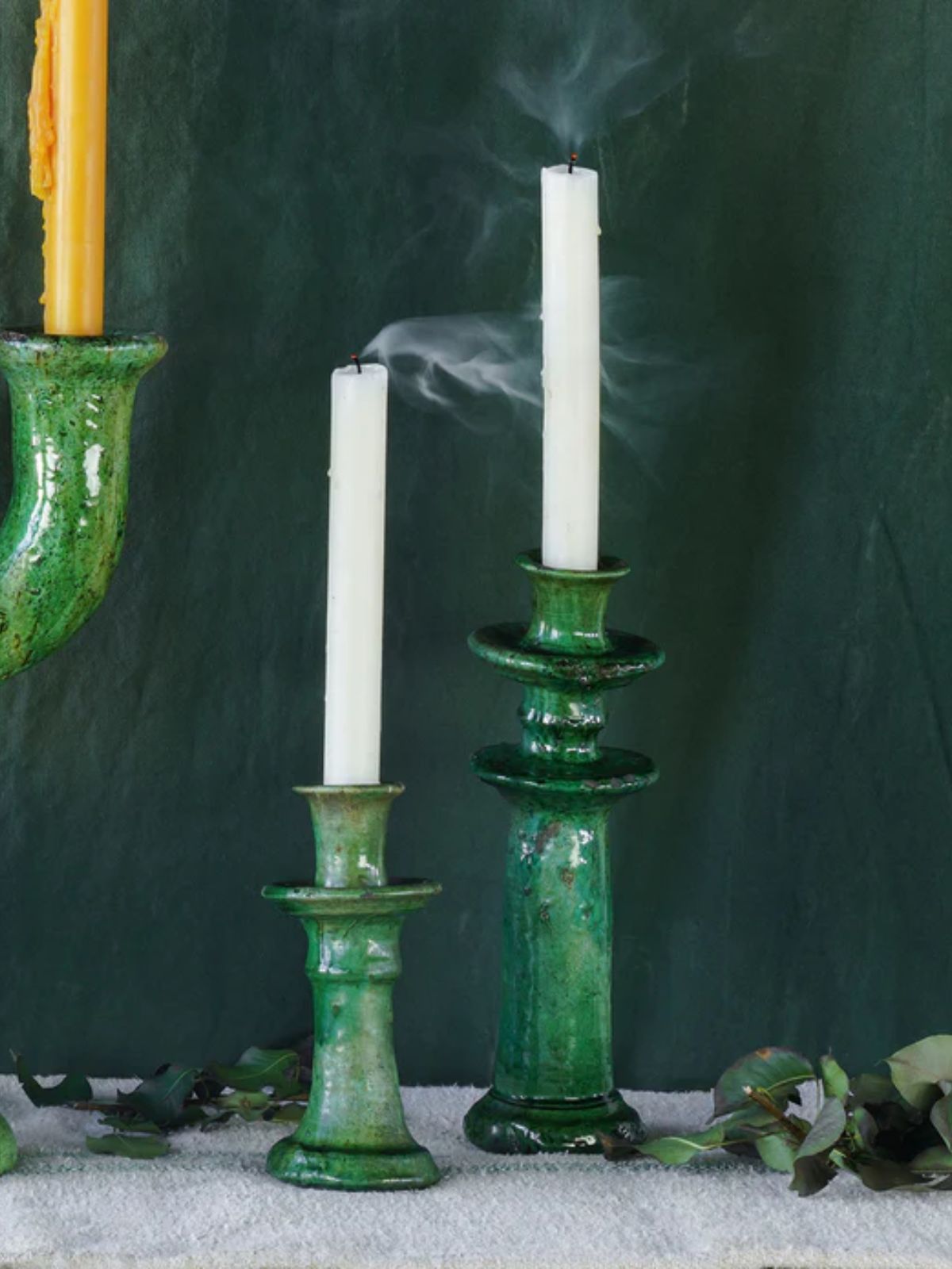 In a village where artisan potters have for centuries shaped vessels for candlesticks, it is not surprising that the Tamegroute Taper Holder is designed to be easily carried from room to room. To modern eyes, the Tamegroute Taper Candle Holder appears decorative with its tapered shape, which conveniently guards wax from dripping on the hand carrying it.
