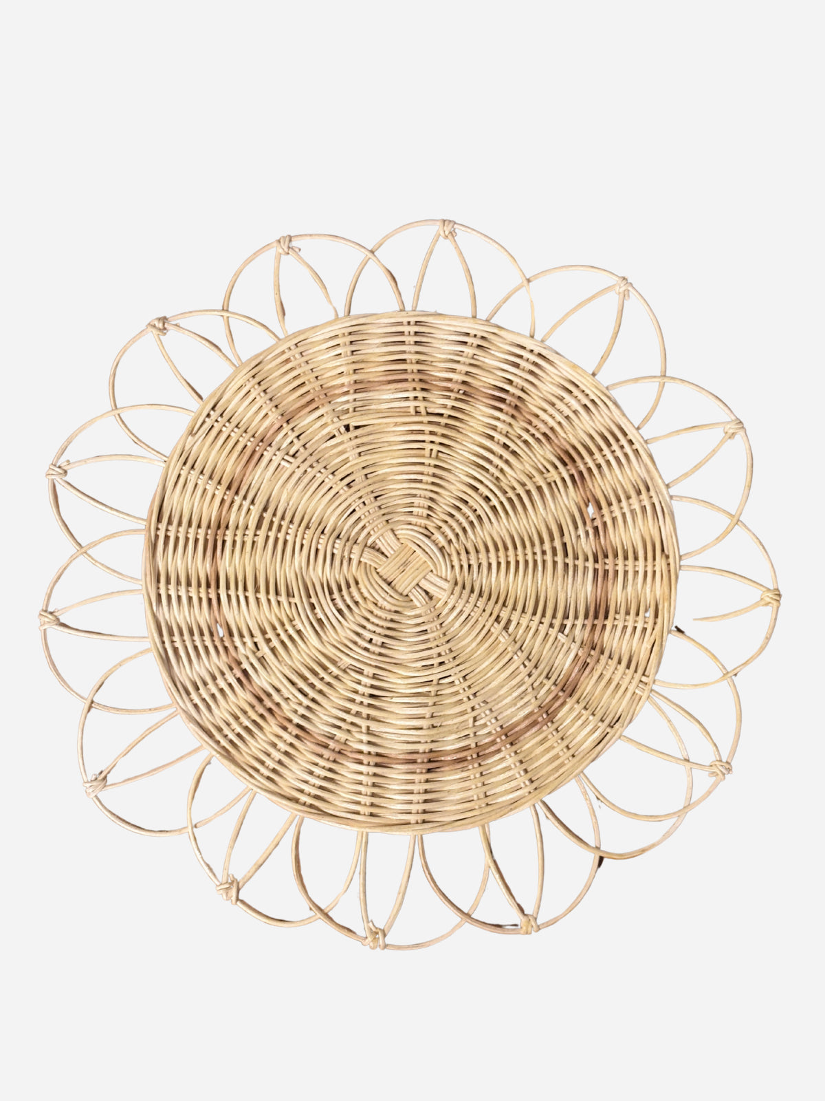 Add a touch of organic beauty to your table with this handcrafted rattan flower placemat. Designed in a floral silhouette, it brings natural texture and warmth to any setting — perfect for layering under dinnerware or styling as a centerpiece accent. Its neutral tone makes it easy to mix with any color palette or occasion.