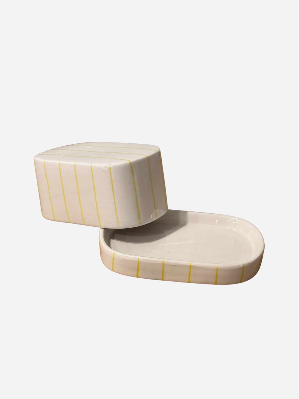 Bring a pop of sunshine to your table with this yellow striped ceramic butter dish. Its clean, modern design and cheerful stripes make it perfect for everyday use or entertaining guests. Crafted from durable glazed ceramic, it keeps butter fresh and adds an easy touch of charm to your countertop.
