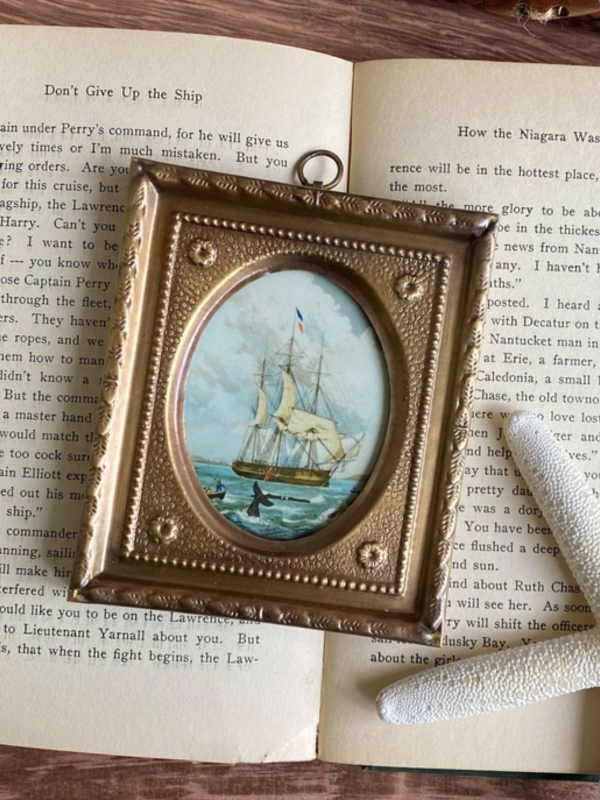 The miniature nautical whaling ship print will be the perfect addition to your nautical, coastal or antique decor. It would also look great in a nautical-themed nursery or playroom, or make the perfect addition to your gallery wall. This print is behind glass in a small antique-look embossed brass frame.