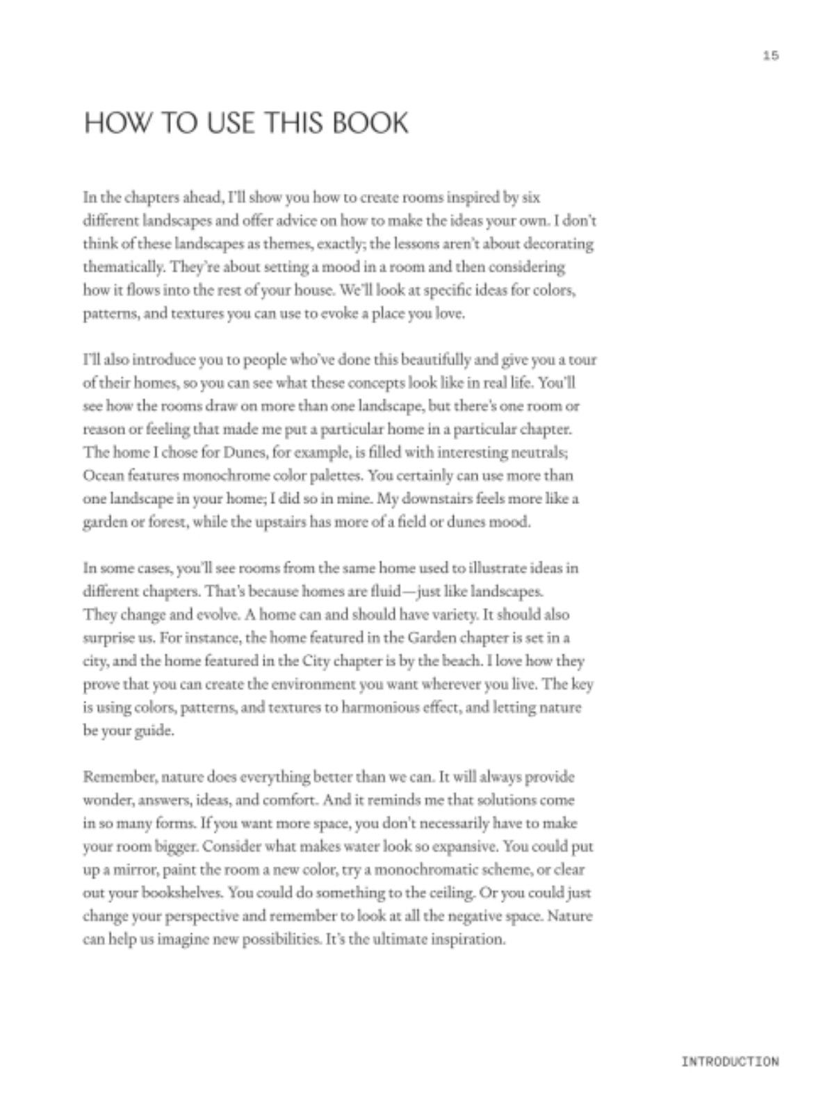 Think of a place outside that contains a mood you want to bring into your home, such as the beach or a garden you saw on your travels. Identify the colors in its landscape and you can choose a room’s paint colors. Pick out its textures and you can decide what materials—rugs, wallpaper, upholstery fabric—to bring into the room. The Harmonious Home walks you through six different landscapes—Dunes, Ocean, Field, Forest, Garden, and City—and shows you how to pull together color and pattern combinations you might not have imagined on your own that evoke the feeling of the place without looking overly thematic.