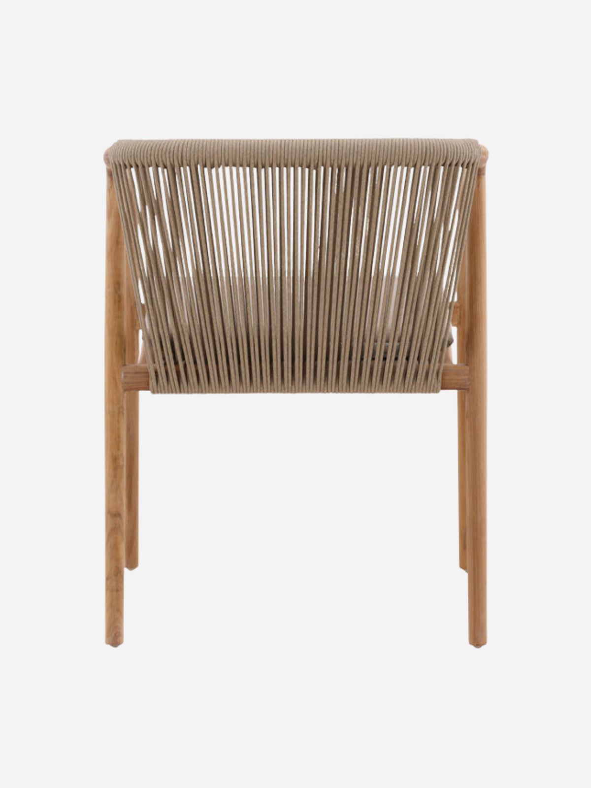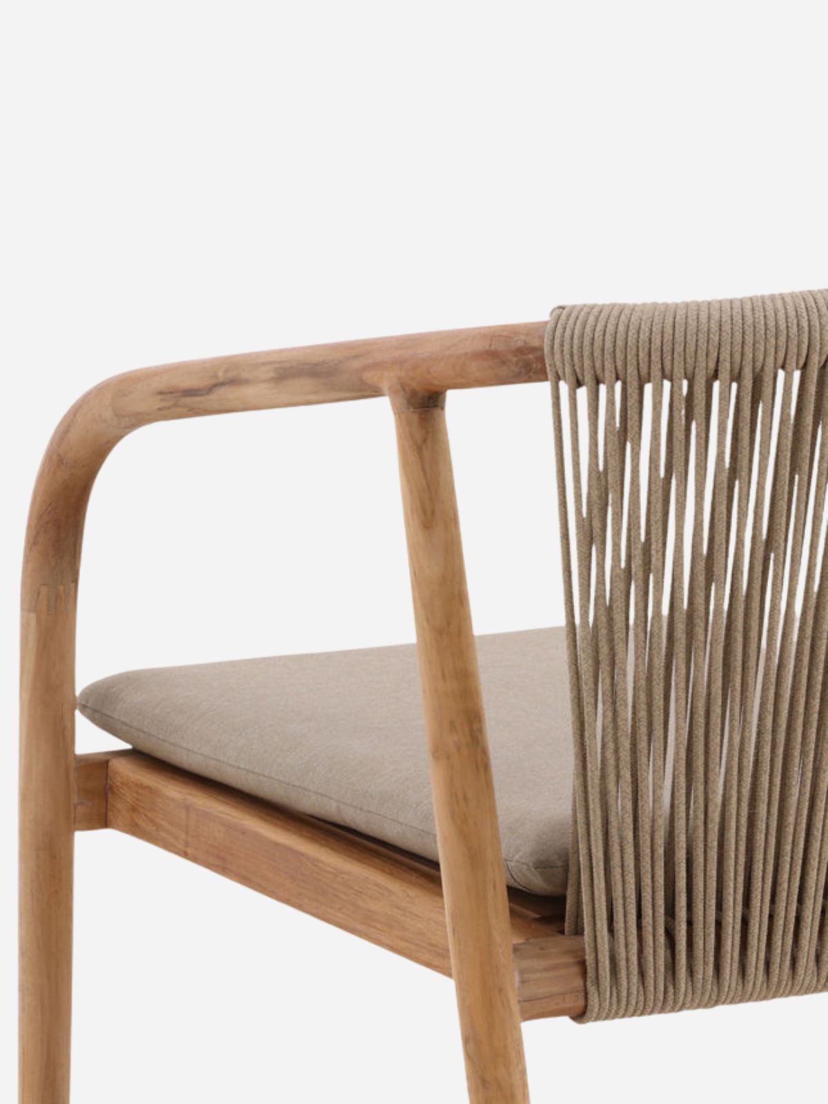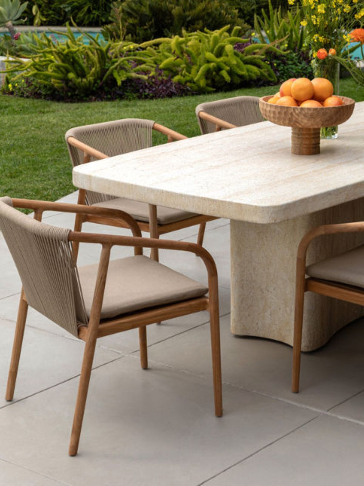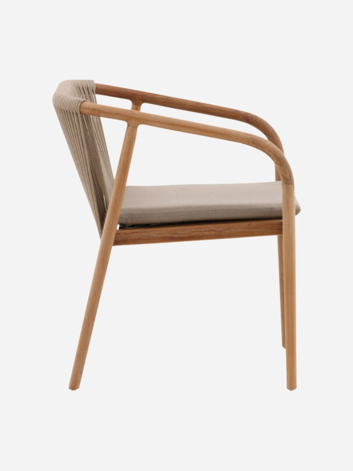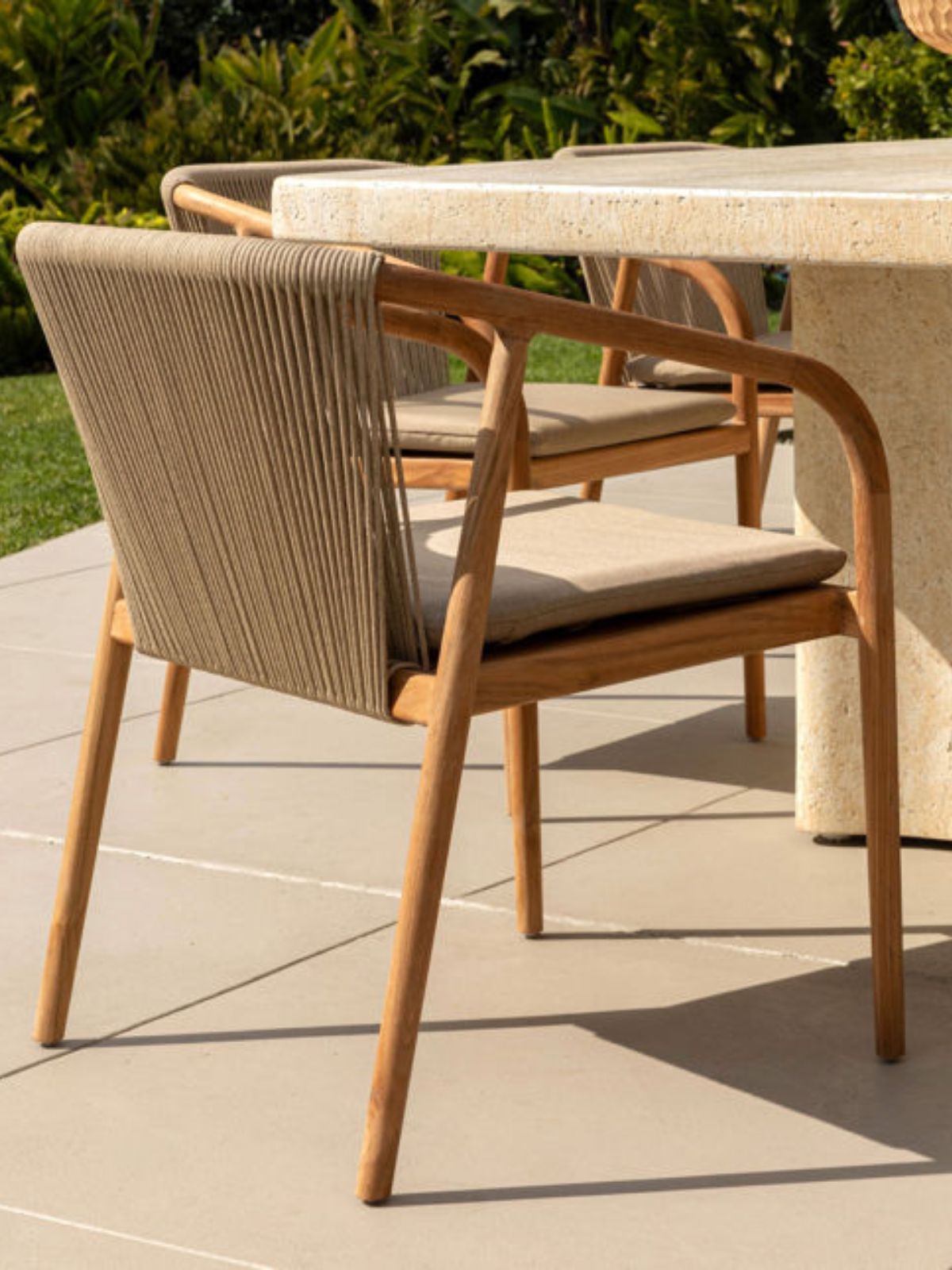 With a clean, modern silhouette, the Carson Outdoor Dining Chair pairs a solid teak frame with hand-woven synthetic rope and a weather-resistant olefin cushion. Its natural tones and durable materials bring a relaxed, coastal feel to any outdoor dining space. Cover or store indoors during inclement weather and when not in use.