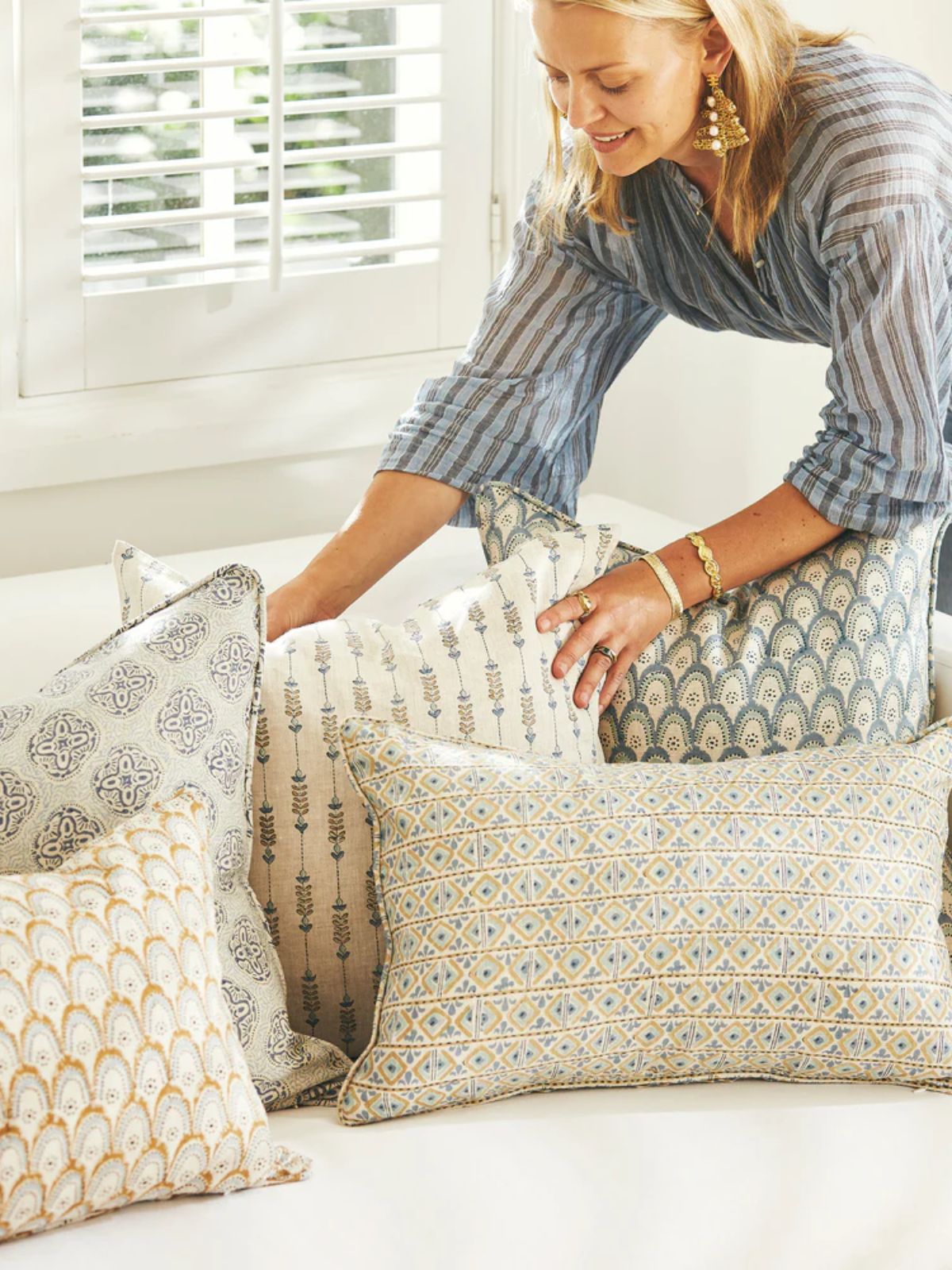 This large scale, feathery design is a contemporary take on the scallop designs we love at Walter G. Azores has been hand block printed by skilled artisans.