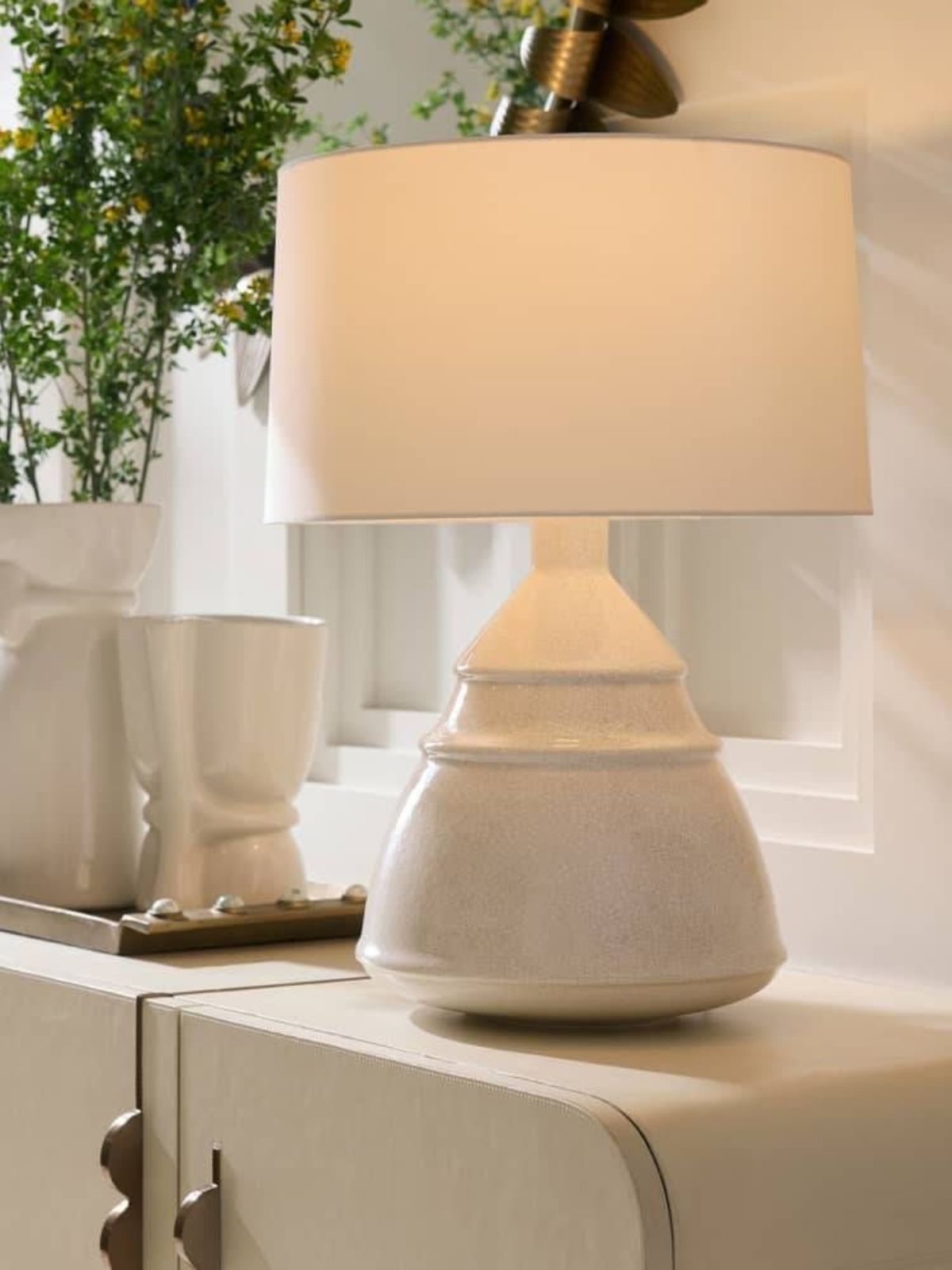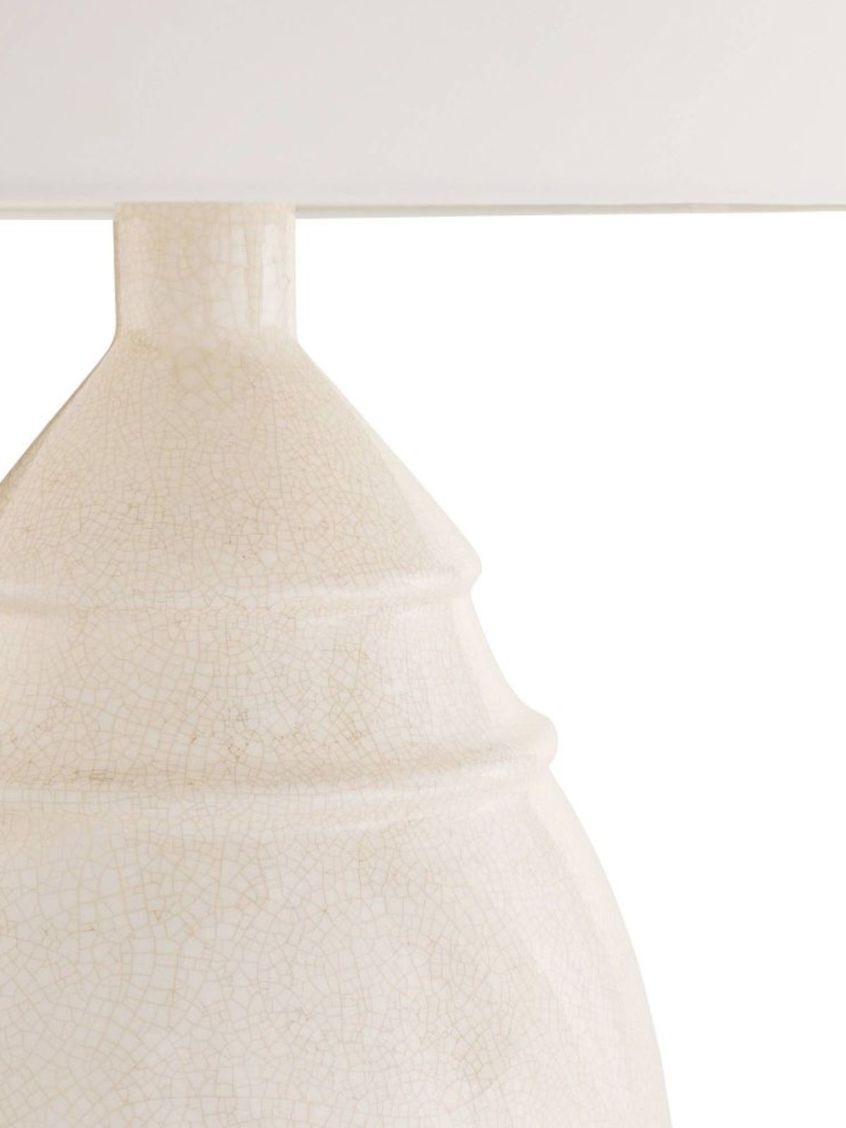 A classic bottle-shaped base of stained ivory crackle ceramic is accentuated with ribbed details to highlight the handmade form. Finished with antique brass-plated steel hardware, the minimalist shape is sculpted in a substantial size, making it an impactful accessory for a living room or on a bedside table. Topped with an off-white microfiber drum shade lined in cotton. Finish will vary.