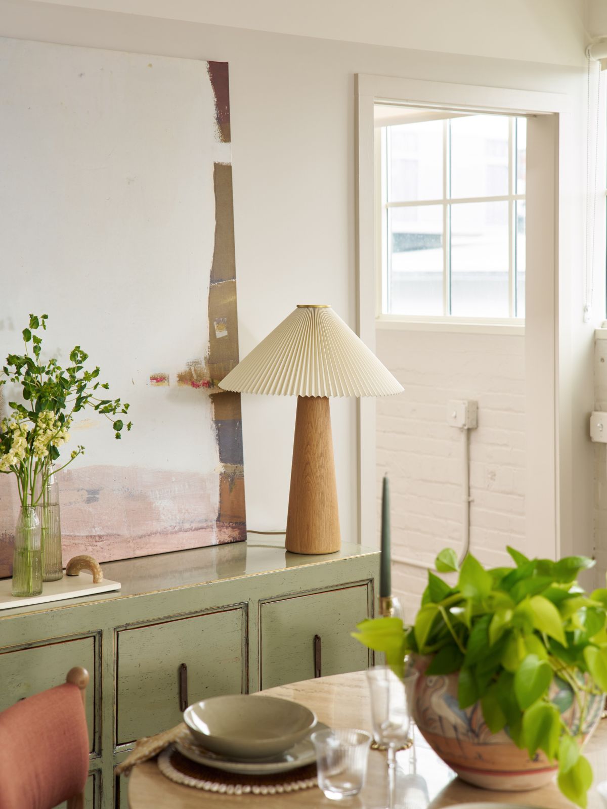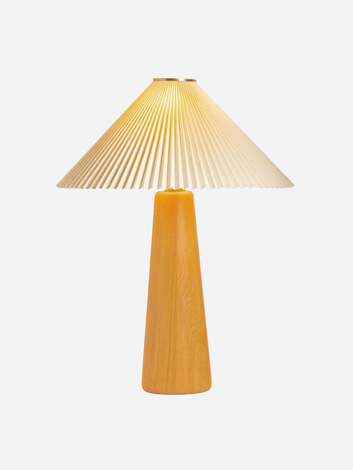 Modern minimal meets traditional. A tapered wood table lamp base is topped with a design-forward pleated shade.